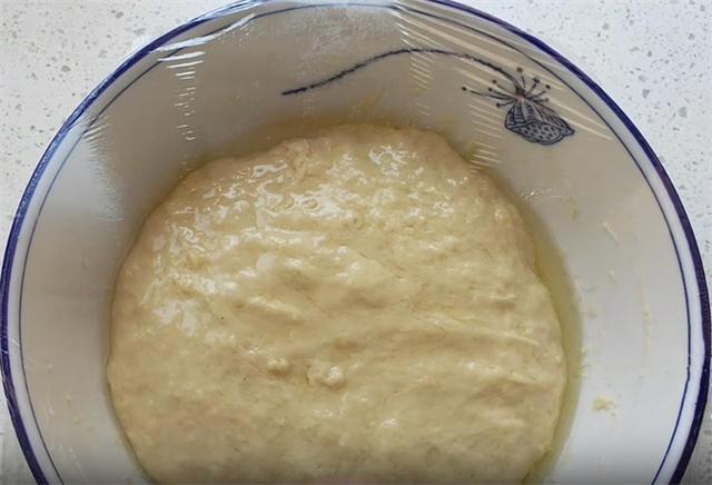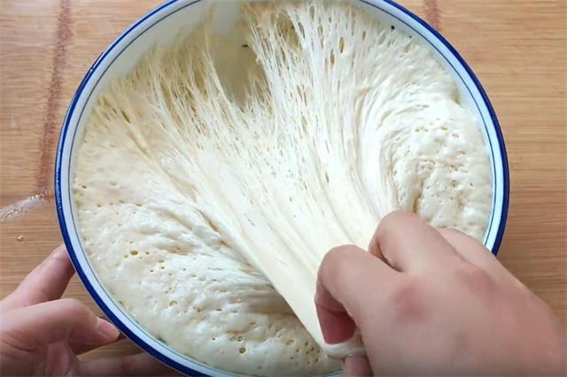 2.经过长时间的低温发酵,面粉中的面筋已经完全形成,大家可以看到面团拉伸自如,而且低温发酵做出的面包口感也特别的松软。