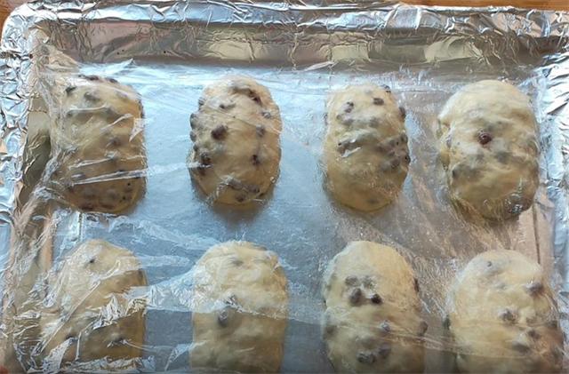 6.烤盘底部刷上油,放入生坯,盖上保鲜膜,二次醒发至2倍大,由于面团已经冷藏发酵,温度比较低,所以说二次醒发的时间会长一些,大约醒发时间约1小时以上。