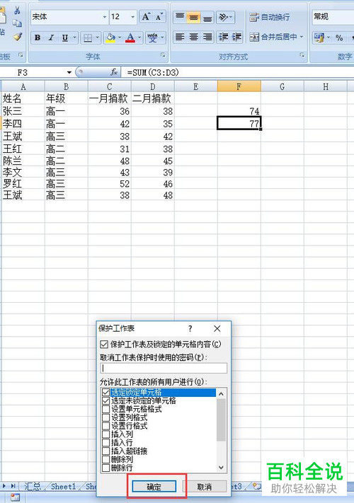 6. 然后在界面中就会打开保护工作表的窗口,我们点击窗口中的选定锁定单元格选项,然后点击窗口的确定按钮。
