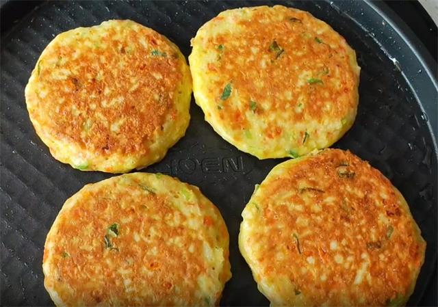6.先不要盖盖子,烙至饼的底面定型,我们翻面,这样烙出来的饼两面受热更均匀,形状也更加好看,翻过来之后,这个时候我们盖上盖子焖一分钟到一分半钟左右,这时我们开盖,山药饼的两面金黄饼蓬松鼓起即可出锅。