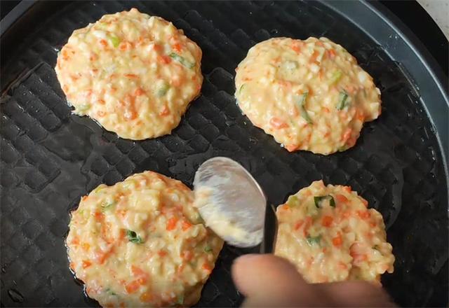 5.电饼铛开小火刷少许的油,油温微热我们下入面糊,用勺子一勺一个面饼,然后稍微整理一下边缘,使烙出的面饼更加圆润。