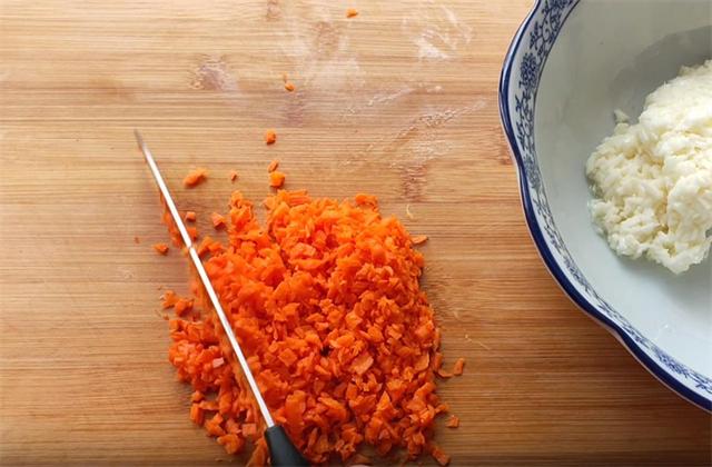 3.用同样的方法把胡萝卜擦成粗丝,然后切成小丁装入碗中。