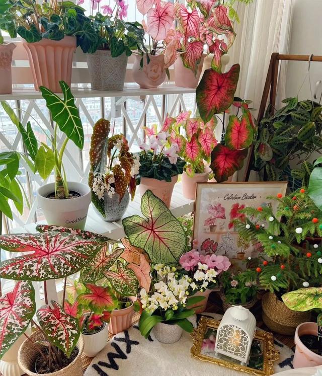 花叶芋虽然不开花,但是其叶片带给人的视觉效果十分震撼,五彩斑斓,花枝招展,时尚美艳,能成为房间的装饰亮点,让人赏心悦目。 所以,花叶芋的观赏价值极强,单独种植或者与其他植物混搭,热带的氛围特别浓郁,也会体现出勃勃的生机,增光添彩。 而且花叶芋,还是人们口中的健康花,表皮的纤毛可以拦截过滤尘埃,有效的提升了空气质量,并且吸收空气中的有害气体,为健康助力。