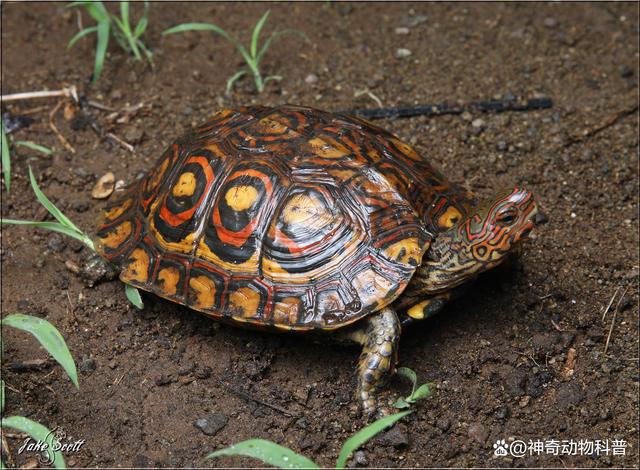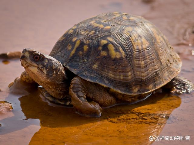 7、卡罗莱纳箱龟 卡罗莱纳箱龟是壳长约10-22厘米、高高拱起像个箱子的龟类,因此得名。它们主要分布在美国缅因州、密歇根州到德克萨斯州和佛罗里达州等地。这种龟类属于杂食性动物,以浆果、蕈类、蚯蚓、蜗牛和昆虫为主食。 卡罗莱纳箱龟生活在开阔的林地、沼泽草甸、泛滥平原以及灌木丛生的草原地带。尽管它们属于半水栖龟类,但大部分时间都在陆地上生活。