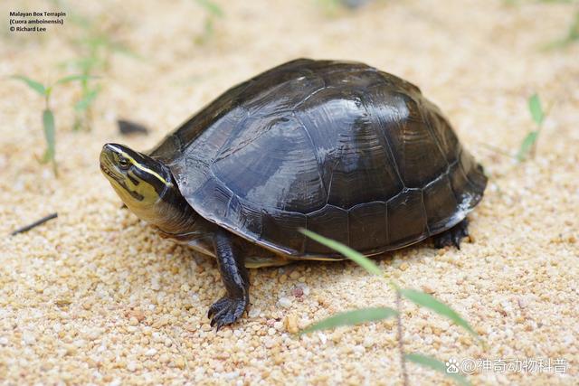 3、安布闭壳龟 安布闭壳龟,又称马来闭壳龟,是半水栖龟类中分布最广的一种。它们广泛分布于东南亚地区,在平原地区的沼泽、湿地、池塘、河流和水稻田等水流缓慢、底泥松软的水域中生活。安布闭壳龟以植物为食,也吃蠕虫、蜗牛等小虫。尽管安布闭壳龟属于高度水生的动物,但有时也会出现在离水域较远的陆地上。如果在饲养环境中,可以将其饲养环境设置成水陆两用的模式。