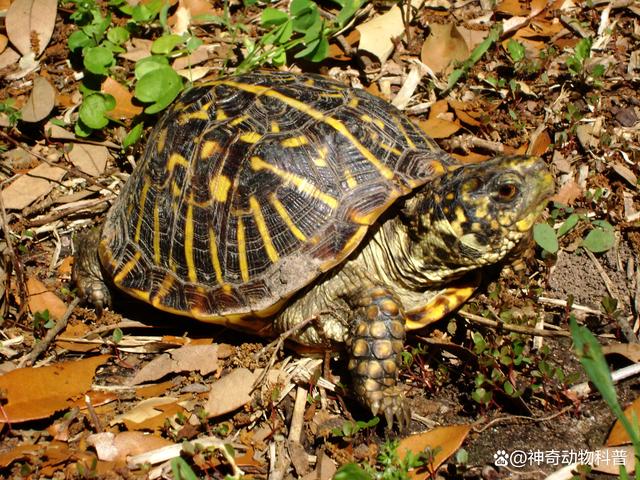 6、锦箱龟 锦箱龟,也被称为“西部箱龟”,与三趾箱龟在习性上相似,只是分布区更为干燥。它们主要生活在美国与墨西哥间的干旱草原地带,甚至可以适应沙漠环境,以昆虫、蠕虫和蔬果等为食。 箱龟具有陆龟在膀胱中储存水分的能力,因此能够忍受比其他箱龟类更高的干旱程度。1986年,锦箱龟成为堪萨斯州的州爬行动物,而在印第安纳州,锦箱龟则被列为濒危物种。