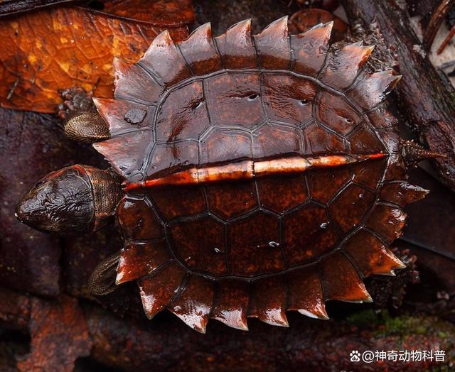 4、刺山龟 刺山龟是一种半水栖龟类,以它们背甲周围所环绕的尖棘而闻名,因此也被称为太阳龟。它们分布在缅甸南部直到苏门答腊和印度尼西亚的一些小岛,生活在海拔100米到170米的雨林地带,并主要以果实、叶子、茎和块根为食。 刺山龟通常栖息于清澈的溪流区域,隐藏在枯枝落叶和草丛之下。幼年时,它们更加倾向于陆*生活,趾间没有蹼,不擅长游泳,常常会被发现在凉爽潮湿的森林底层漫步。