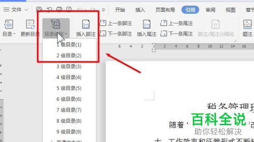 在使用wps版的word软件处理文档的时候,如果想要在word内设置目录级别的话,应如何操作呢?接下来就由小编来告诉大家。 具体如下:1. 第一步,使用wps打开一个word文档,进入文档主页后,选中一段文字,然后点击上方菜单栏中的引用选项,再点击引用工具栏中的目录级别功能,点击下拉菜单中的1级和2级目录选项。