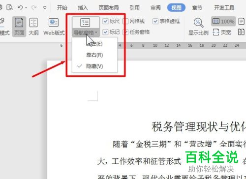 5. 第五步,返回文档主页,然后点击上方菜单栏中的视图功能,然后点击视图工具栏中的导航窗格选项,在下拉框中,可以选择开启目录侧边栏。