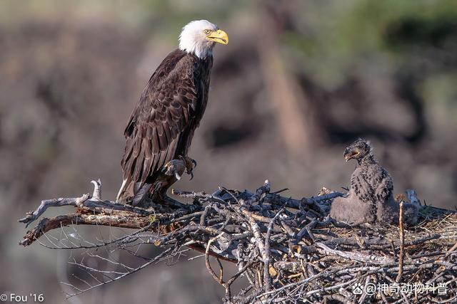 3、白头海雕 白头海雕是一种终身配偶制的鸟类,也被称为美洲雕,是美国的国鸟之一。它们具有十分强烈的情感连结,只与一个配偶一生相伴。如果其中一方死亡,另一方通常会很快跟随而去。白头海雕具有淡黄色的眼、嘴和脚,羽毛分布在身体不同部位的颜色则有所不同,头、颈和尾羽为白色,而其他部位则呈暗褐色,非常美丽壮观。在繁殖季节,白头海雕常常成群结队出现在食物较为丰富的地区,选择在悬崖峭壁上或高大树木顶端筑巢。