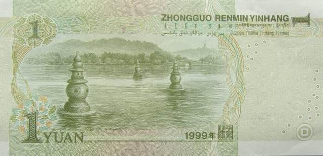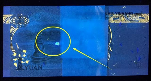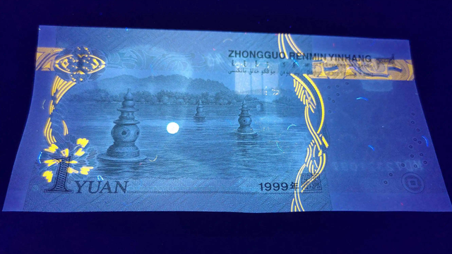 特别是99版的一块钱,有很多荧光品种也是非常漂亮的,比如漫天飞雪,高丝密等等这些,其中有一个也是非常有特点,叫做月亮荧光,就是在99版一块钱背面的三潭映月这个图案当中,湖的中间有一个像月亮一样的圆,好像是月亮的倒影出现在湖的中间,显得美轮美奂。