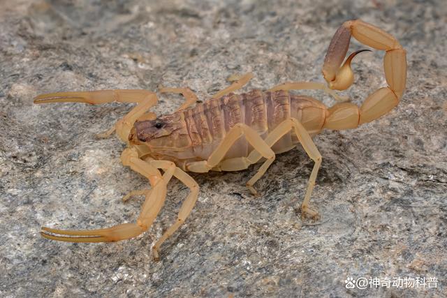 5、巴勒斯坦毒蝎 巴勒斯坦毒蝎,又称以色列金蝎,是地球上毒性最强的蝎子之一,主要分布在以色列和远东其他地区。它们的尾巴上长有一个装满毒液的尾刺,由球形底和尖状弯钩组成。一旦接触到生物,尾刺中的毒液就会自动从钩刺中射出,注入受伤者的体内。如果不及时进行治疗,受伤者会出现严重的不适症状,如极度疼痛、抽搐、瘫痪等,并可能导致死亡。
