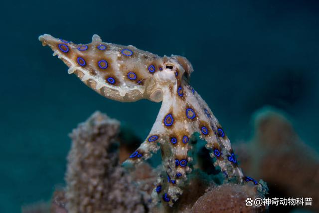 3、蓝环章鱼 蓝环章鱼分布在太平洋西部和印度洋北部沿岸海域,是一种具有极高毒性的生物。相传其毒性比眼镜蛇还要高出50倍,而且每只蓝环章鱼携带的毒素量足以杀死26名成年人。如果被它刺伤,体内的毒液会迅速释放到身体中,虽然一开始没有什么疼痛感,但在1小时后毒性会开始发作。蓝环章鱼毒液中的成分可以破坏受害者的生命系统,侵占大脑肌肉,阻止血液凝固,并导致伤口大量出血和剧烈疼痛,随后全身发热、呼吸困难,可能导致直接死亡。