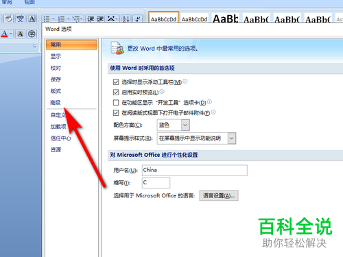 3. 第三步打开【Word选项】窗口后,根据下图箭头所指,点击左侧【高级】。