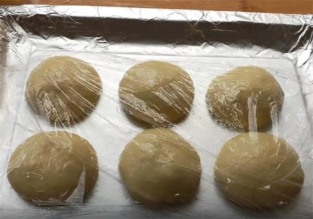 5.烤盘底部刷油,放入生坯,盖上保鲜膜二次醒发至2到3倍大,最好是放入烤箱内醒发,温度高醒发得更快。