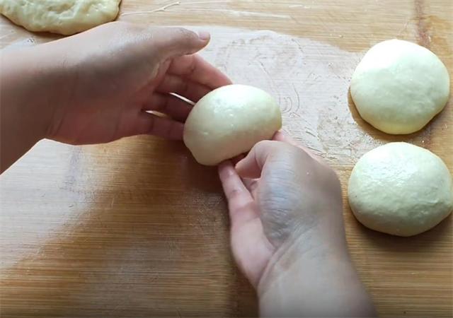 4.我们把它分成六个面剂,像揉馒头那样把它底面揉光滑,揉成一个圆形的小面团,这样我们的生坯就做好了,因为我们这个面和的特别的软,所以说我们在整理生坯的形状的时候,一定要像这样向里按压翻转,使生坯尽量的高一些,这样做出来的面包形状会更好看一些。