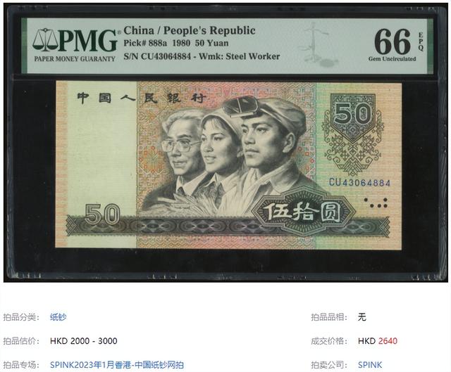 这导致8050留存至今的数量极少,收藏价值特别高。一张品相完好,但号码较差的,也在今年1月的SPINK拍卖中,拍出了2640港币。 在1992年8月20日,1990年的50元纸币发行。这张纸币对防伪工艺进行了大量升级,使用寿命非常长。这个年份的50元,一共发行了169种冠号,由于数量较多,表现要差不少。