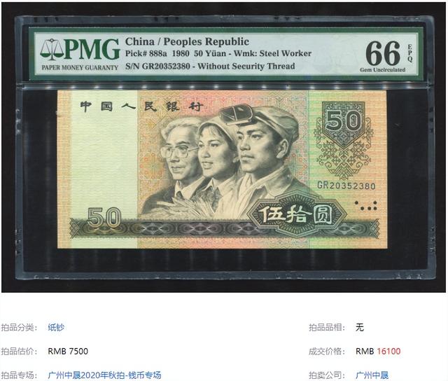 其中又以50元纸币最为亮眼,它已经坐稳了四版币币王的宝座。 那么,你家还有这种币面图案是工人、农民和知识分子的老50元吗?赶紧找找看,它们一张甚至能拍出30多万。 需要注意的是,50元纸币根据年份、品相和冠号的不同,其表现也有较大的差距。具体情况如何,一起来了解一下。 年份不同的50元四版50元一共有两种不同的年份。 其中1987年4月27日发行了1980年50元,由于防伪技术一般,在流通没几年后,就改版发行了1990年50元纸币。因此,8050只发行了24个冠号,在1992年8月就实行了只收不付。