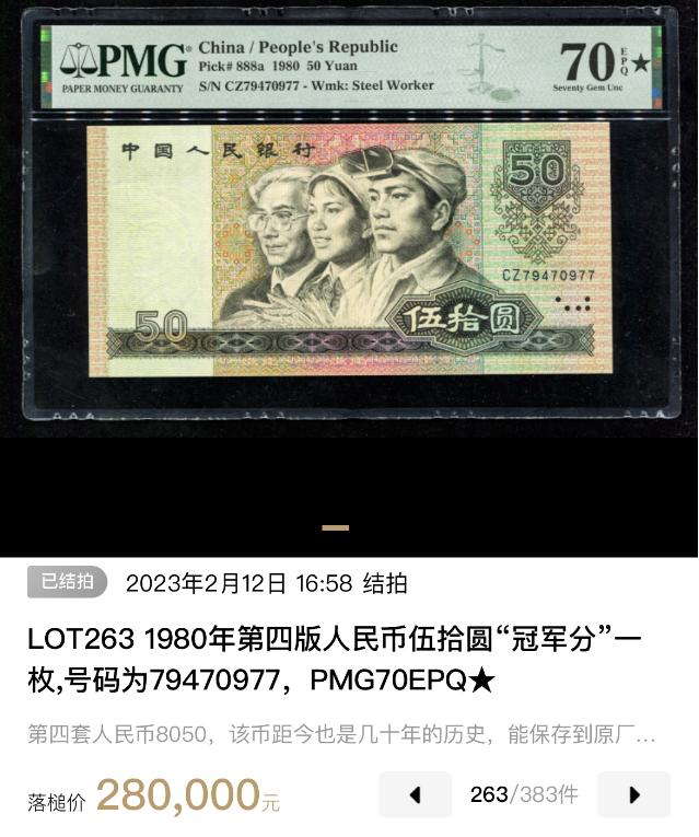 而在2月的中晟拍卖中,一张满分的80年50元,更是拍出了28万,加佣金一共是32.2万! 从中,我们也能看出纸币品相的重要性。你还有老纸币的话,一定要记得好好保存。 注意,8050特别紧俏,即便是币面有缺损的,同样有人抢着要,能翻7倍左右。 除了品相之外,号码也会对8050产生巨大的影响。