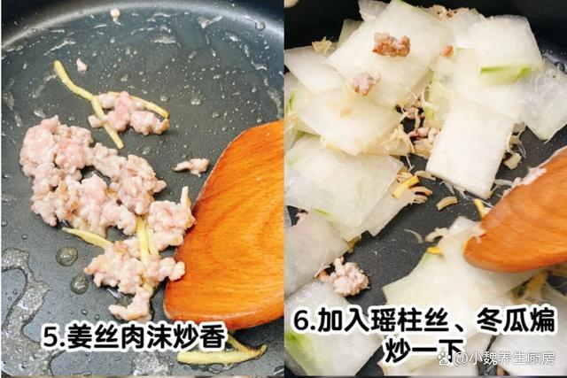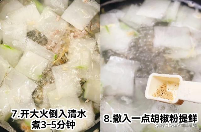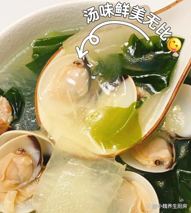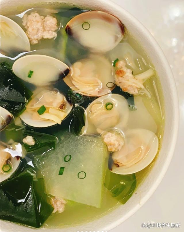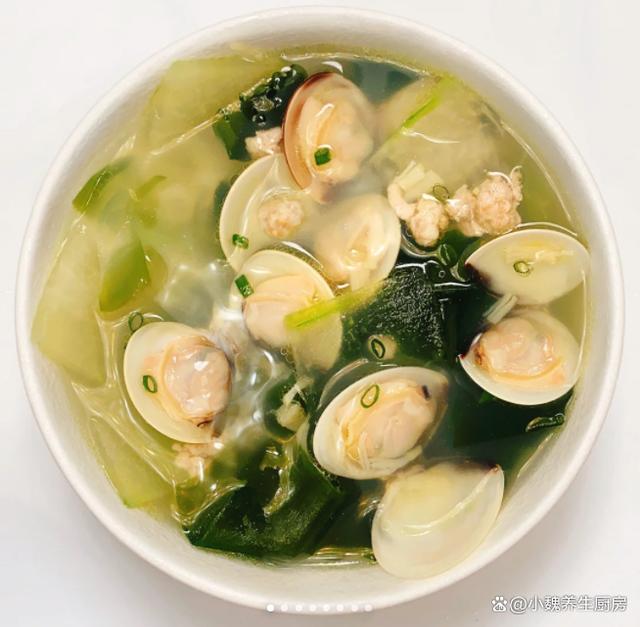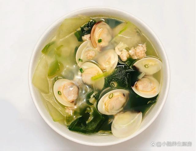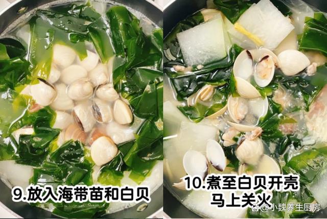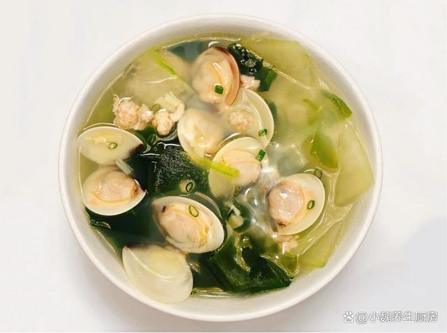 第六步:锅底烧热之后,加上食用油烧热乎,加上一些猪肉末炒香,倒入一些瑶柱丝和冬瓜,快速煸炒一会儿。 第七步:加上适量清水煮到沸腾,加入少许胡椒粉,放入一些海带和白贝,煮至白贝全部开壳。 第八步:加上少许食盐,撒上一些葱花点缀,焖煮一小会儿,这道冬瓜白贝海带汤就制作完成了,盛夏必喝这款鲜汤,老少皆宜。 冬瓜白贝海带汤是一款超级鲜美的汤品——冬瓜白贝海带汤,里面添加白贝,冬瓜和海带等食材,汤品会更加鲜美,营养倍增,喝起来特别舒服,帮助个头增长,胃口越来越好。 网友们,你们是否喝过这款冬瓜白贝海带汤吗?(上述配图都出自网络)