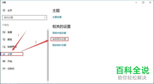 2. 打开下图所示窗口后,点击左侧列的“主题”。在主题界面后,找到并点击“桌面图标设置”。