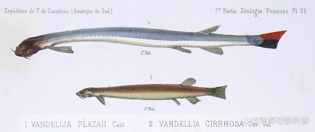 牙签鱼 9、牙签鱼 牙签鱼是世界上最小的脊椎动物之一,其体长通常小于10厘米。由于其体形细长而透明,很难在水中被发现。它们主要依靠寄生生活,通常会钻入大鱼的鳃中,用棘钩住并吸食鱼血,因此也被称为“吸血鱼”。在生活有牙签鱼的河流中游泳和小解是行人的大忌,因为牙签鱼对体液极其敏感,一旦感测到,便会顺着流向迅速钻入人体内,吸取血液,甚至噬食人体组织。除非进行手术,否则牙签鱼不会从人体内钻出来。因此,人们对牙签鱼必须保持高度警惕。