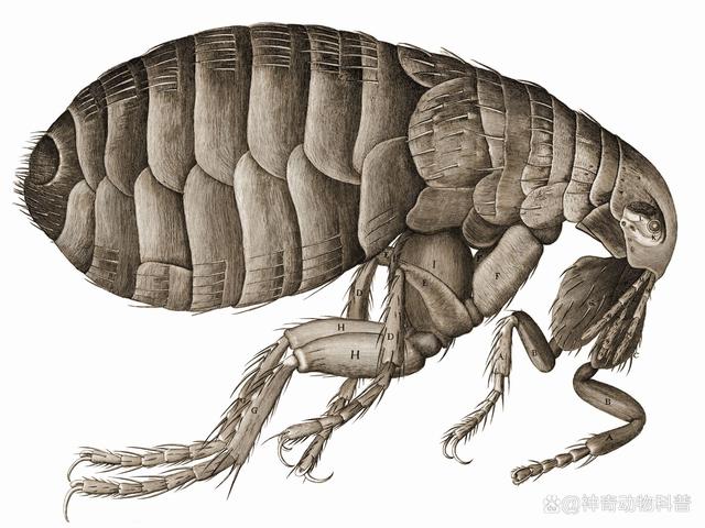 显微镜中跳蚤的素描 4、跳蚤 跳蚤是一种广为人知的寄生虫,它的成虫可以长达12个月不吃任何东西,并利用吸血来获得养分。这种昆虫主要寄生于哺乳动物和鸟类身上,比如人体、猫和狗等。跳蚤具有刺吸式口器,因此雌性和雄性跳蚤均能吸血。跳蚤的幼虫没有足部,呈圆柱形,营自由生活。它们拥有咀嚼式口器,并以成虫的血便或有机物质为食。在吸血寄生的同时,跳蚤还会交配并产卵,为下一代的繁殖奠定基础。 防止跳蚤的叮咬非常重要,尤其是对于家养宠物的人而言。应该采取相应的预防措施,比如洗浴宠物、定期清洁房屋和床铺等,以避免跳蚤寄生和繁殖。