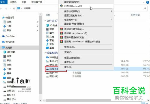2. 在打开的页面,以【E盘】为例,在上面【右键】,在打开的菜单中,选择【启用BITLOCKER】选项;