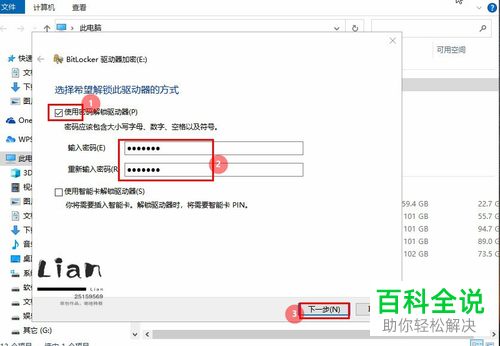 3. 如图,在弹出的"Bitlocker驱动器加密"窗口中,上方勾选上【使用密码解锁驱动器】选项,下方设置【密码】,点击右下方的【下一步】按钮;