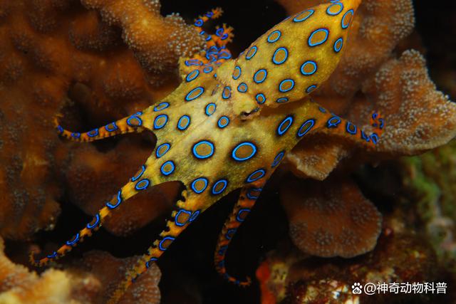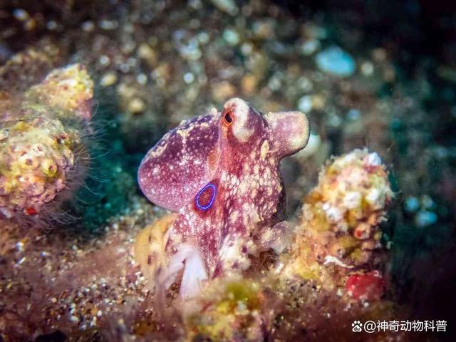 图6、毒豹猫章鱼 和蓝环章鱼一样,这种奇怪的名字叫毒豹猫章鱼,有时也叫摩蒂章鱼,是一种身体上有蓝色环的小型物种。然而,它们很容易通过身体两侧的2个蓝色环来区分,而不是遍布全身。