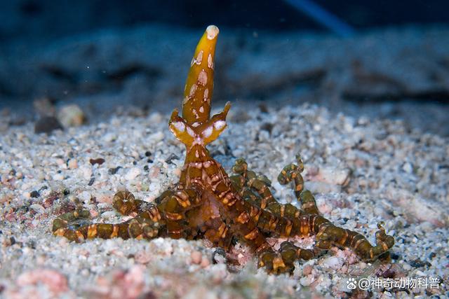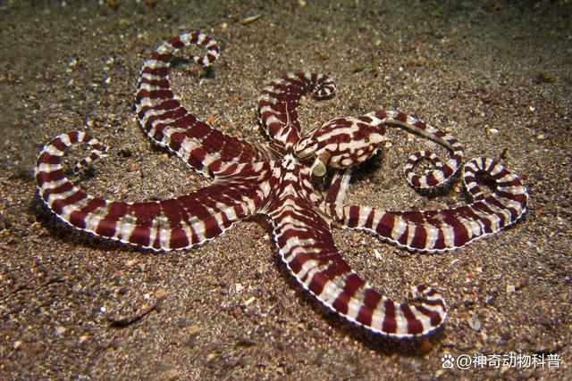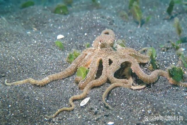 图2、神奇章鱼 神奇章鱼经常被误认为是拟态章鱼,它是另一种可以改变体形使其看起来像其他海洋物种的物种。这两种章鱼甚至具有相似的颜色。但是,您可以留意一些明显的差异。