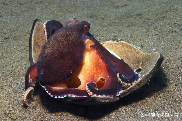 图7、椰子章鱼 这是北苏拉威西岛最令人印象深刻的章鱼物种之一,无论是大脑还是肌肉。因其习惯躲在椰子壳中,甚至在地幔下携带庇护所而得名,这样他们就可以隐藏在任何地方。它们还擅长使用棍棒和碎片等工具来保护自己免受掠食者的侵害。