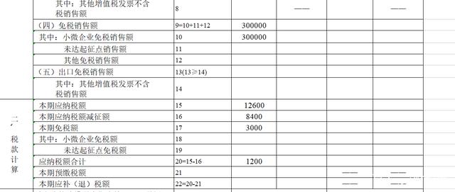 由于应税销售总额没有超过45万,对应的普票销售额可以享受免征优惠,即“免税销售额”为30万;“本期应纳税额减征额”为42×2%=0.84万,主表中的这个数据不需要自己填列,填完《增值税减免税申报明细表》系统自动就带出来了。所以在进行申报时,注意填表的顺序,先填明细表,主表中大部分数据根据明细表会自动生成。