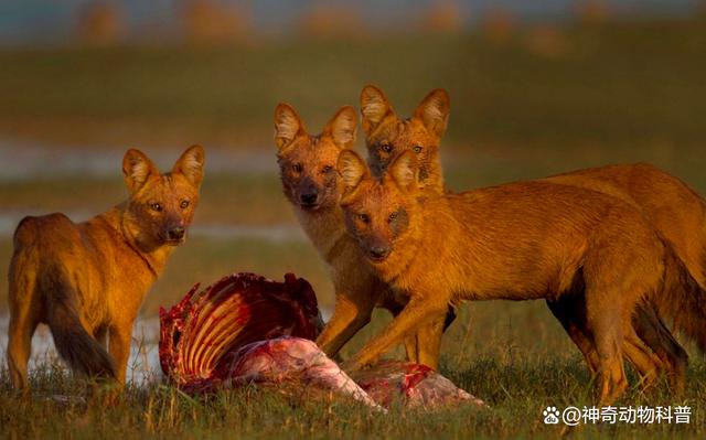 非洲野犬 7、豺 豺是一种典型的山地动物,它们喜欢群居,并擅长围猎。豺是一种坚定不移的集体主义实践者,通常由强壮而狡猾的头领带领一个或几个家族临时聚集而成,群体规模在2-3只到10-30只之间不等。豺喜欢采用接力式穷迫不舍和集体围攻、以多取胜的方式来猎食,这种基本猎食方式与狼非常相似。除了狩猎小型哺乳动物外,豺有时也会成群向其他猛兽如狼、熊、豹等发动挑逗和进攻,以吓得它们落荒而逃或爬上大树,从而夺取它们口中的食物。豺是一种高度社会化的动物,它们的行为表现出明显的集体意识和互助精神。