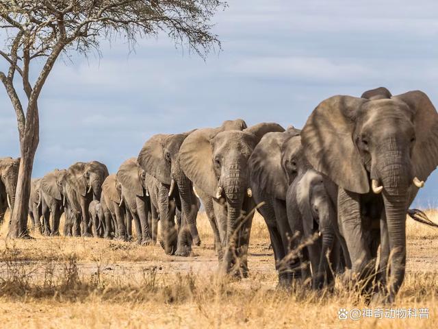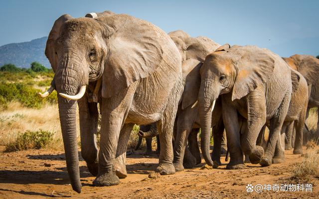 狼 4、非洲象 非洲象是一种非常团结的动物,它们喜欢群居,通常有20-30只成员组成一个家族群。每个家族群都由一头雌象统率,大多数成员都是她的雌性后代。雄象在群体中没有地位,一旦长到15岁就必须离开群体,并且只在交配期间才会偶尔返回群体。在非洲象群体中,有着严格的等级制度,并且在行动时按照地位高低排序。无论是吃喝、交配还是走路,所有的动作都很有序。群体中的成员之间通常表现得非常和平和友好,这种群体互助的精神让人感到钦佩。