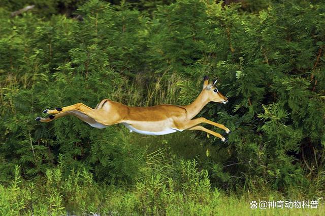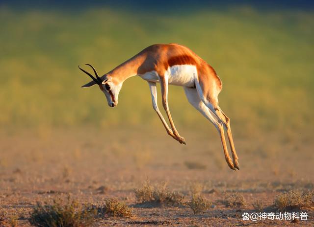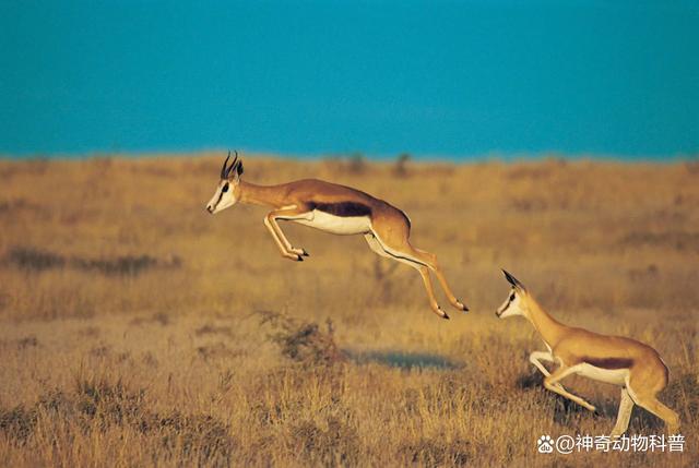 美洲狮幼儿 5、跳羚(3-3.5米) 跳羚是一种身长约1.2-1.5米,肩高在68-90厘米之间,体重约37-50千克的动物。它们极其善于跳跃,每次跳跃时脊背会弓起、四肢下伸而靠拢,可以跳起约3-3.5米的高度!跳羚通常群居生活,天生擅长奔跑和跳跃,时速可达94公里,仅次于叉角羚和猎豹。跳羚利用这种跳跃方式来应对头号天敌猎豹的攻击,以跳跃闪避其攻击或扰乱它的视线,这使得它们能够更好地保护自己,提高生存几率。尽管跳羚的身材相对较小,但它们爆发出的跳跃力量却是惊人的,展示了其出色的生存能力。相比之下,人类在跳跃方面远远不及跳羚,跳羚在这一方面完胜人类。