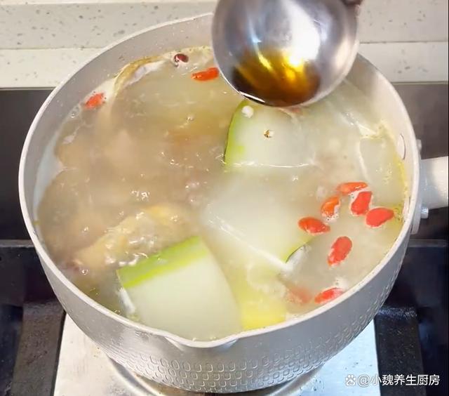 第七:继续炖一个小时左右,放入一些冬瓜块,让其煮至半透明即可,丢入洗净的枸杞子,调入一小勺食盐调味,调入少许白胡椒粉,快速用汤勺搅动,最后丢入葱花点缀即可,出锅开吃,这款薏米芡实冬瓜炖鸭肉汤就烹饪完成了。 薏米芡实冬瓜炖鸭肉汤是一款夏季必喝的祛湿汤品,比大鱼大肉更受欢迎,鸭肉非常鲜嫩,汤品巨鲜美,滋补身体,还有不错的祛湿效果,保证身体的健康,学过给家里人尝一尝。 (www.ws46.Com)