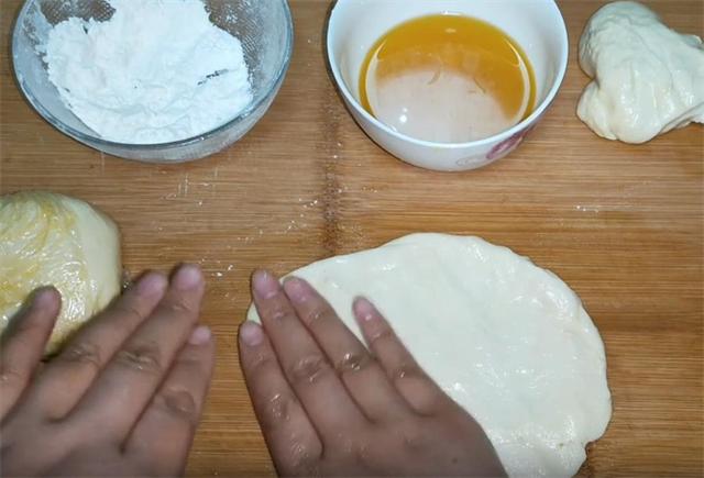 5.早起的时候我们把饼坯拿出来,然后可以开始预热电饼铛了,这个时候的饼坯特别的软,延展性非常的好。我们先用手把它按扁,这样更容易擀制,然后左右开擀,把它擀成椭圆形,接下来从下向上卷起,利用拉伸力把椭圆变成圆形。