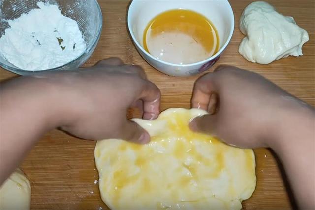 3.我们把面剂按薄推开,均匀的涂抹上一层油,撒上一些干面粉,这个作用就起到隔绝的作用,这样做出的饼才会起层。提醒大家注意这个油和面粉的量一定要够,如果不够的话,到时候粘在一起饼就没有层次了。