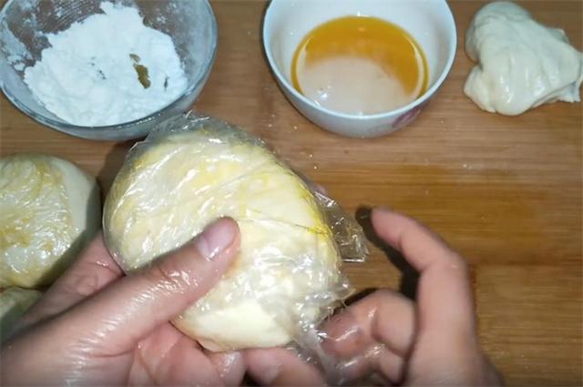4.我们向里折叠这个四角,把它整理成圆形的小饼坯,涂抹上一层油,用保鲜膜密封包好,放入冰箱冷藏一夜,因为夏季温度高,最好放入冷藏,防止发酸,冬季的话放室内就可以。