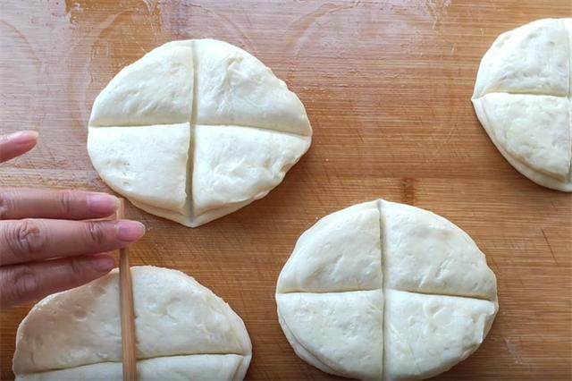 4.再把两张面饼摞在一起,然后用筷子用力在面饼上压出一个十字花,相当于把它四等分,但是注意不要压断。
