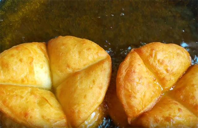 5.锅中油温五成热下入生坯,五成热的油温就是油的气泡完全没有以后,这个油温炸制的时候它是最容易起发的,炸至飘起来,我们翻面,翻的时候要轻一点,防止散开,小火慢炸4到5分钟,反复翻面,炸至表皮金黄即可出锅。