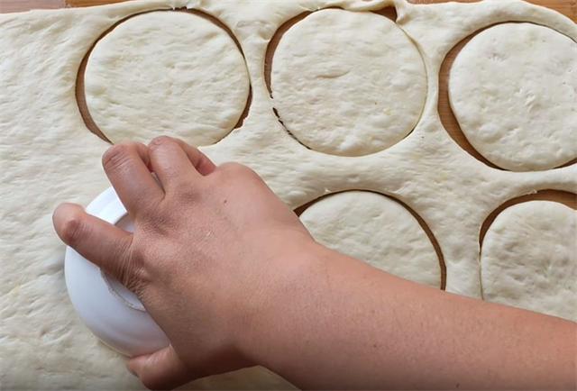 3.然后我们把它擀成椭圆形或者是长方形的大面饼,擀好以后可以松弛5分钟到10分钟,找一个小碗或者是杯口扣出一个圆形的小面饼。