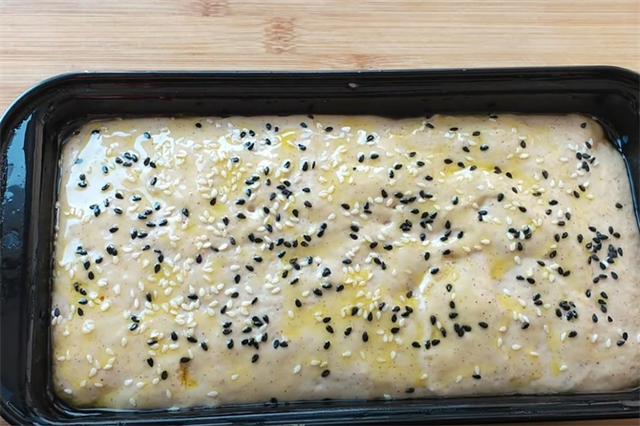 6.另一盒我们用烤箱烤制,撒一些黑白芝麻作为点缀,上面刷一层油来锁住水分,烤箱预热上火140到150度,下火160度,放中层烤35到40分钟。