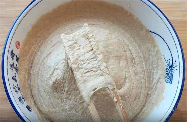 3.准备面粉300到400克,边倒边搅拌,因为本身大米不含有筋力,所以说我们蒸的时候容易塌陷,但是加入面粉之后,一是更容易消化,二是蒸的时候口感更筋道,而且不易塌陷,盖上保鲜膜饧面40分钟。