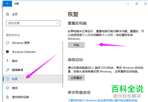 3. 第三步,在下图所示的更新和安全页面中,点击页面左侧的恢复选项,接着点击恢复下面的开始选项。