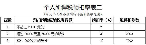 注意:对上一个完整纳税年度内每月均在同一单位预扣预缴工资薪金所得个人所得税,且全年工资薪金收入不超过6万元的居民个人,扣缴义务人在预扣预缴本年度工资薪金所得个人所得税时,累计减除费用从1月开始,直接按照全年6万元计算扣除。也就是说累计收入超过6万元的时候,再预扣预缴个人所得税,并在《个人所得税扣缴申报表》相应纳税人的备注栏标明“上年各月均有申报且全年收入不超过6万元”。 2、劳务报酬所得 扣缴义务人向居民个人支付劳务报酬,也需要预扣预缴个税。对于纳税人每次收入不超过4000元的,减除800后的余额计入应纳税所得额;超过4000元的,减除20%后的余额计入应纳税所得额。按照劳务报酬所得预扣预缴率表确认相应的预扣税率和速算扣除数。 具体计算公式为: 劳务报酬预扣预缴税额=应纳税所得额×预扣率-速算扣除数=收入×20%(或-800)×预扣率-速算扣除