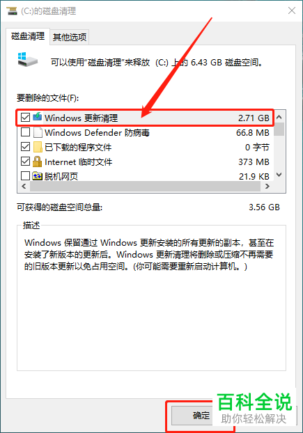 5. 如图,在打开的窗口中,勾选上“Windows 更新清理”选项后,点击“确定”按钮。