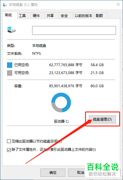 3. 在弹出的属性窗口中,点击右下方的“磁盘清理”按钮