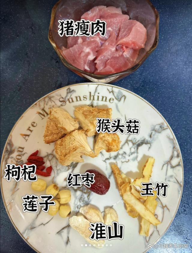 时光匆匆,六月马上要结束了,七月在向我们招手,气温也也越来越热,到了三伏天会更加炎热,达到地狱级别的炎热,身体会非常虚弱,气色会非常差,晚上经常出现失眠的情况。人到了40岁以后,生活压力非常大,经常出现失眠的情况,需要调整好作息,平常可以尝一尝这款靓汤——猴头菇淮山玉竹莲子瘦肉汤,食材简单,隔三差五炖一锅,鲜美滋补,好处多多。七月将至,建议要多喝这汤,顺应时节,补足营养,迎接三伏天。  【猴头菇淮山玉竹莲子瘦肉汤的制作技巧】 食材明细:选购新鲜猪瘦肉350克(猪瘦肉是猪肉的部位,要挑选肉质红润,摸起来有弹性的猪肉,瘦肉可以做成肉质,肉丸子或炖汤,为身体补充许多能量,让气色越来越好 ),猴头菇几个,若干个红枣,枸杞子少许,冷水少许,纯净水少许,干莲子20克左右,老姜一大块,少许料酒,干淮山药30克,玉竹20克左右,若干根香葱,一丢丢胡椒粉,食盐若干,其他。